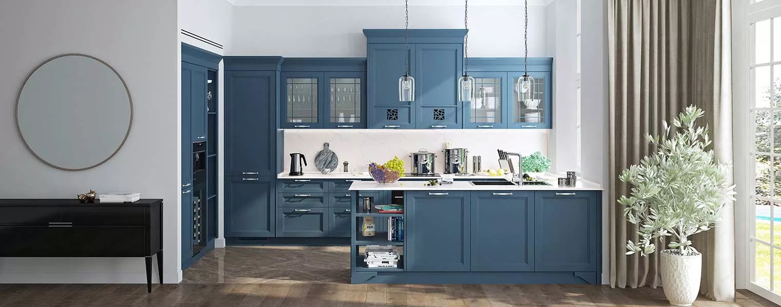 • Классический стиль: Глубокие оттенки синего для гарнитура и стен.